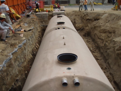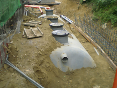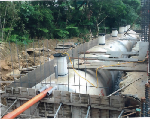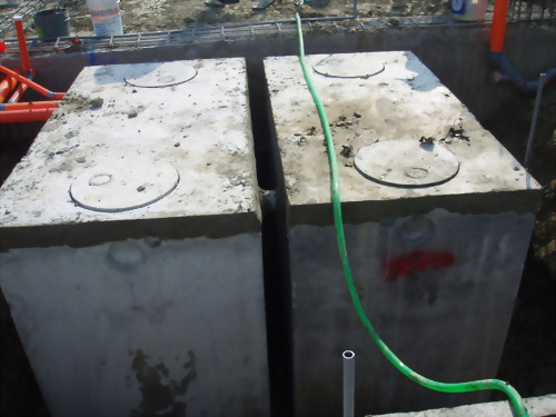 工程案名:楠梓自由停車場 本案採用泓泉牌(TS) 30人、50人份各一組 本建案使用本公司產品TS-30人及TS-50人份預鑄式污水處理槽,安裝於高雄楠梓自由停車場建案工程,本新建汙水設施主要處理槽內日常生活之沐浴廢水,處理方式以目前處理效率最穩定、可靠;操作方便之接觸曝氣法處理之設計參數為設計數據;其原理為以鼓風機強制曝氣,使流入之廢水充分攪拌球狀浮動生物濾材並提供水中溶氧藉此作為微生物懸浮生長所需,經一段時間後,即開始生成生物污泥(微生物)並形成生物觀,於好氧狀態下吸附、氧化廢水中有機物的處理方法,固於曝氣槽內添家球狀浮動生物濾材,不需於放流槽內添加生物藥劑,避免業主於使用期間及因抽肥後水位降低造成生物濾材堵塞槽內溢流口圖增加維護困難。
