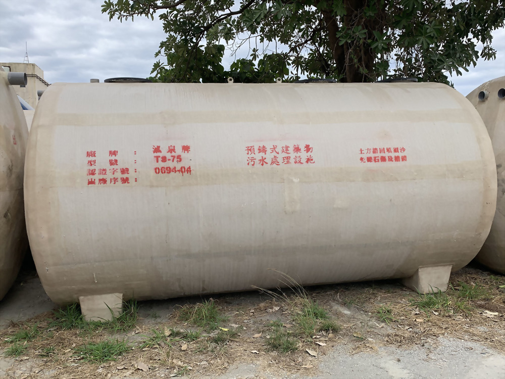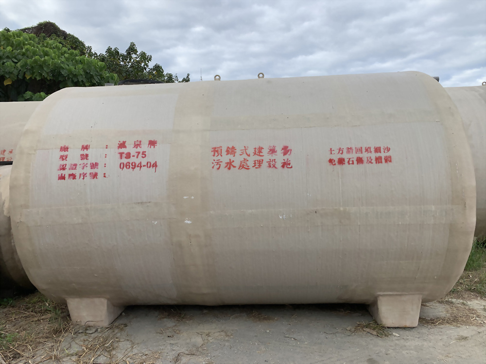 泓泉牌TS-75型號預鑄式建築物汙水處理設施,經環保署與內政部審共同審定通過並給予登記。本產品經廠鑄完成後,運至工地配接外管及機械設備。基本上採地上式、半地下式或地下式等皆可,但為兼顧實用與美觀,本產品應以埋入地下為宜,如此經覆土(施工)完成後,地面及人孔蓋皆為平坦,地上空間得以有效利用之。